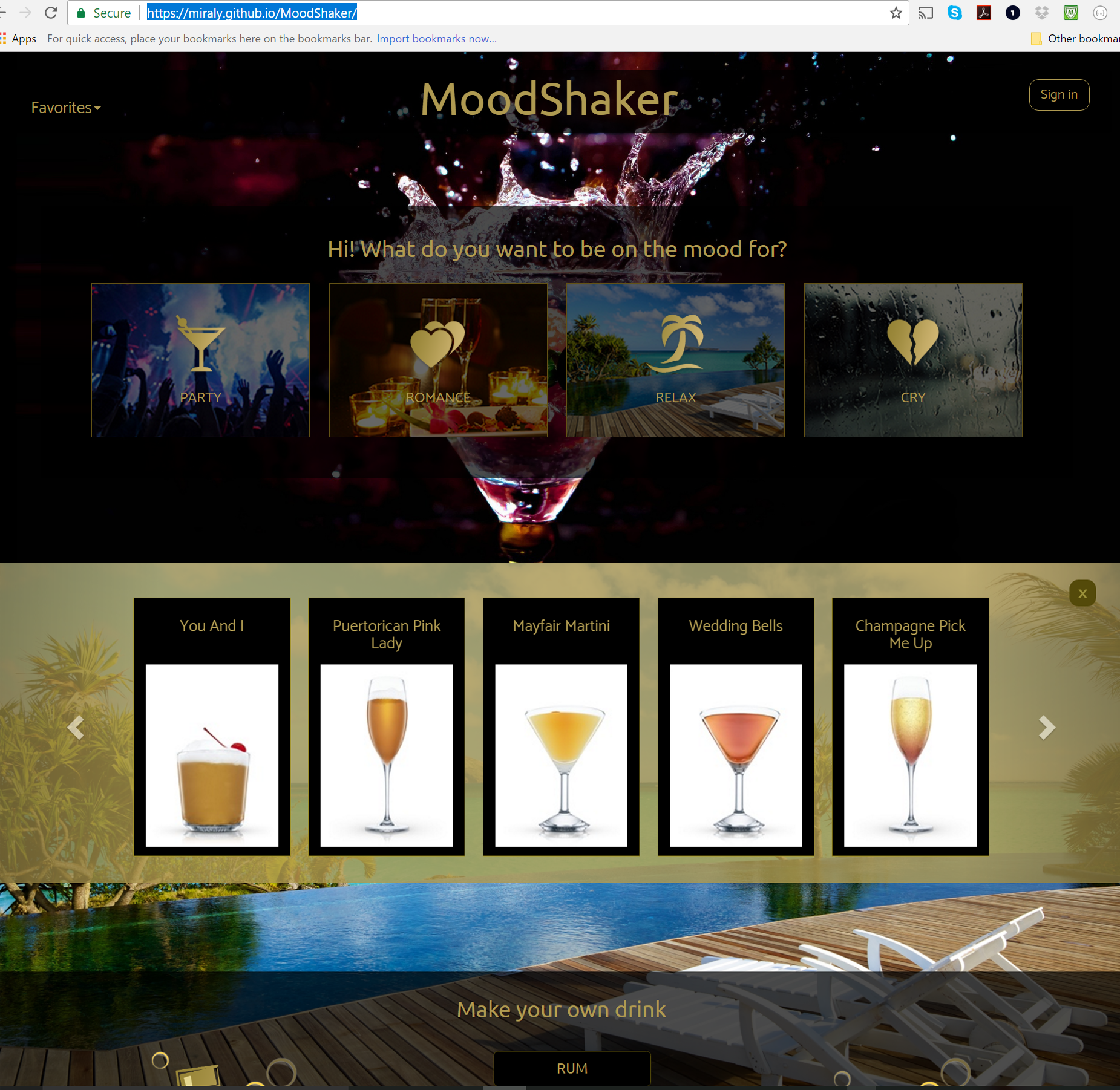 MoodShaker app offers list of drinks and music based on selected mood. Used: HTML5, CSS3, JavaScript, JQuery, 2 APIs, Facebook login, BootStrap....