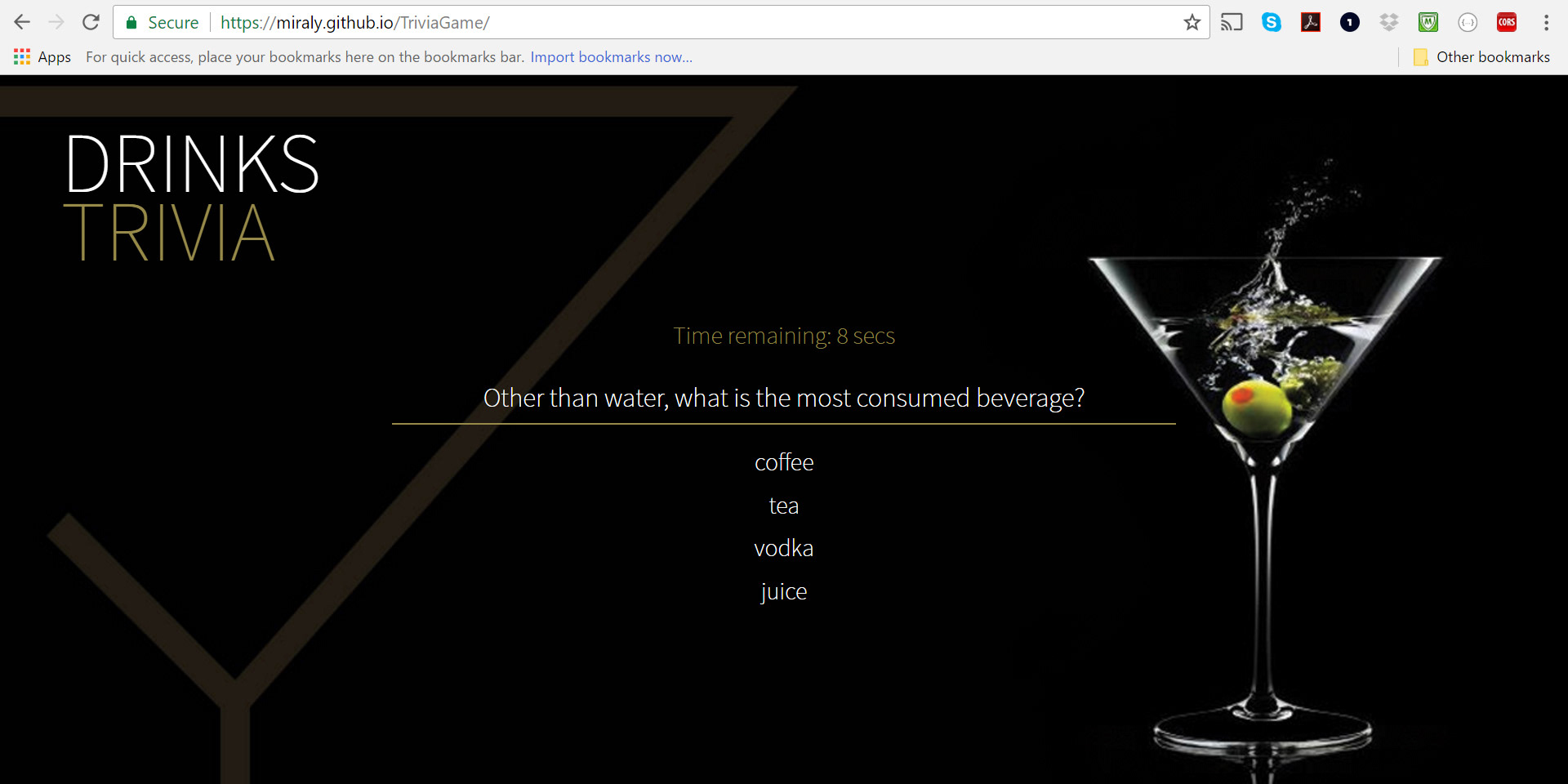Drink Trivia is a trivia style game. HTML, CSS, JavaScript, JQuery.